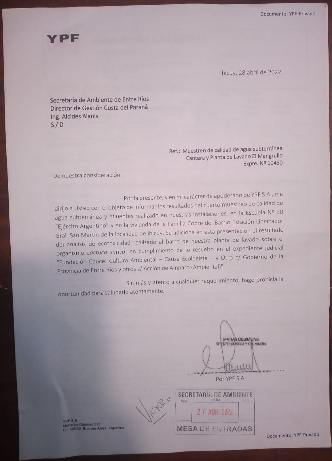 Resultados Muestreo Ambiental YPF - Cantera "El Mangrullo"