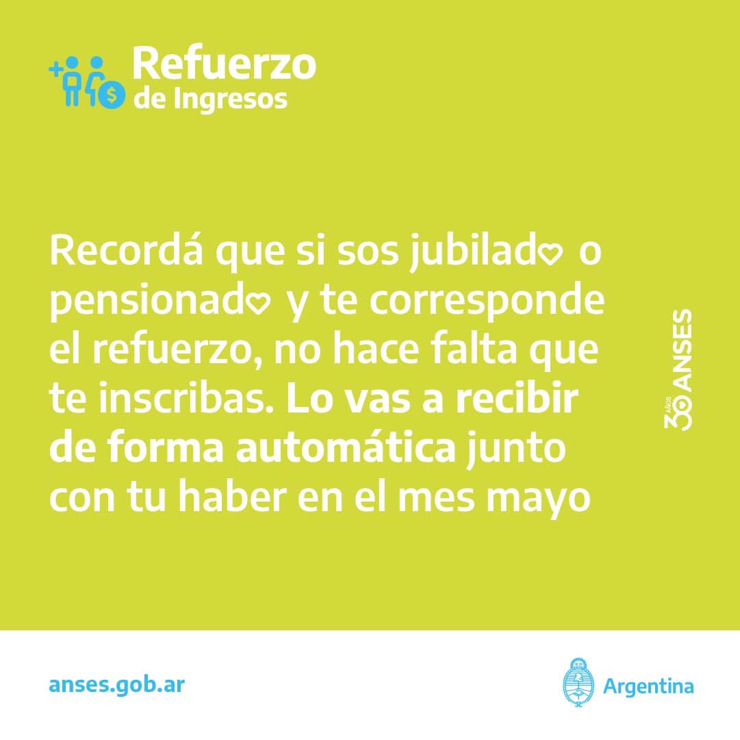Recordá que si sos jubilada, jubilado, pensionada o pensionado y te corresponde el refuerzo, no tenés que inscribirte. Vas a cobrarlo de forma automática junto con tu haber en mayo.