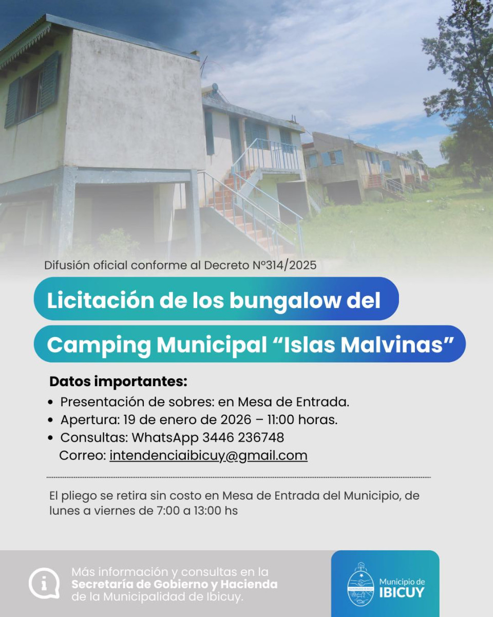 La Municipalidad de Ibicuy informa que se encuentra abierto el llamado a Licitación Pública Nº 1/2025, según Decreto Nº 314/2025, para la concesión, previa puesta en valor, de las unidades bungalow del Camping Municipal “Islas Malvinas”.